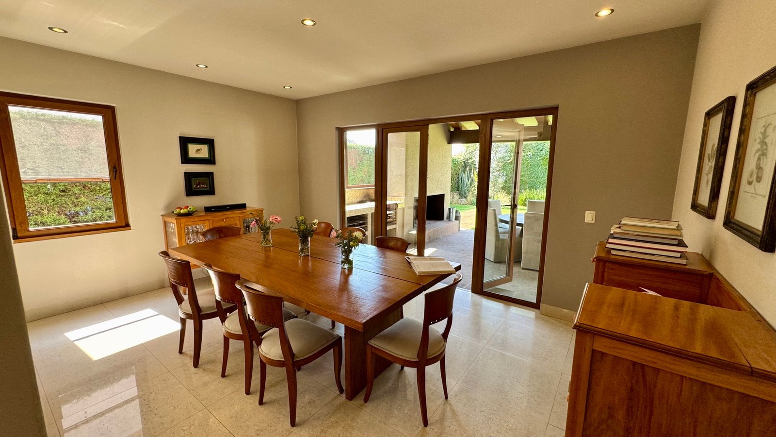 Construida sobre un terreno de 596 m² y con 800 m² de construcción, la casa se distingue por su generosa distribución y sus espacios pensados para la convivencia familiar. La sala principal con chimenea crea un ambiente cálido y acogedor, complementada por el comedor y desayunador que se integran naturalmente al exterior mediante grandes ventanales.